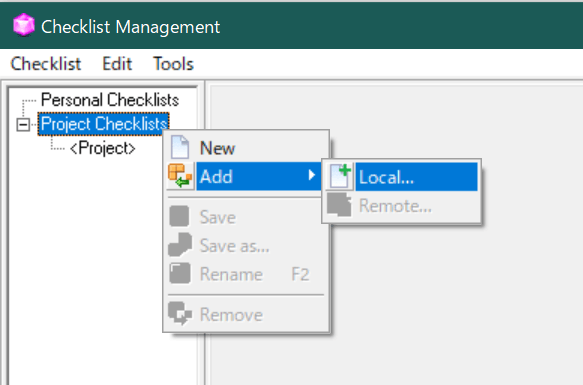 - エクスポートしたチェックリスト(.xbckl)をインポートするには、[Checklist Management] ダイアログの左ペインで [Project Checklists] を右クリックして [Add] > [Local] を選択し、.xbcklの場所を指定します。