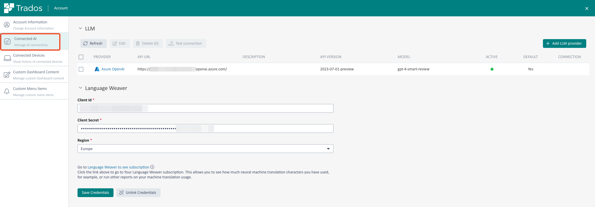 Although no separate Large Language Model (LLM) subscription is required for AI Essentials, we’ve now introduced Connected AI, which enables users to configure their own LLMs directly from the Manage Account area if they choose. This means you can now connect your Azure OpenAI models natively in Trados for use in Generative Translation and Smart Review - no need to coordinate setup with RWS.