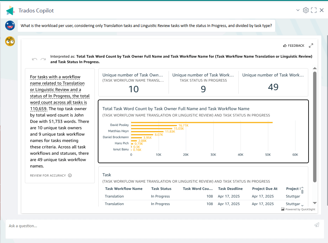 When linguists call in sick, clients ask about timelines, or managers need updates, having fast, accurate information is critical. With LLM-powered intelligence, Smart Insights taps directly into Trados data, helping project managers stay productive.