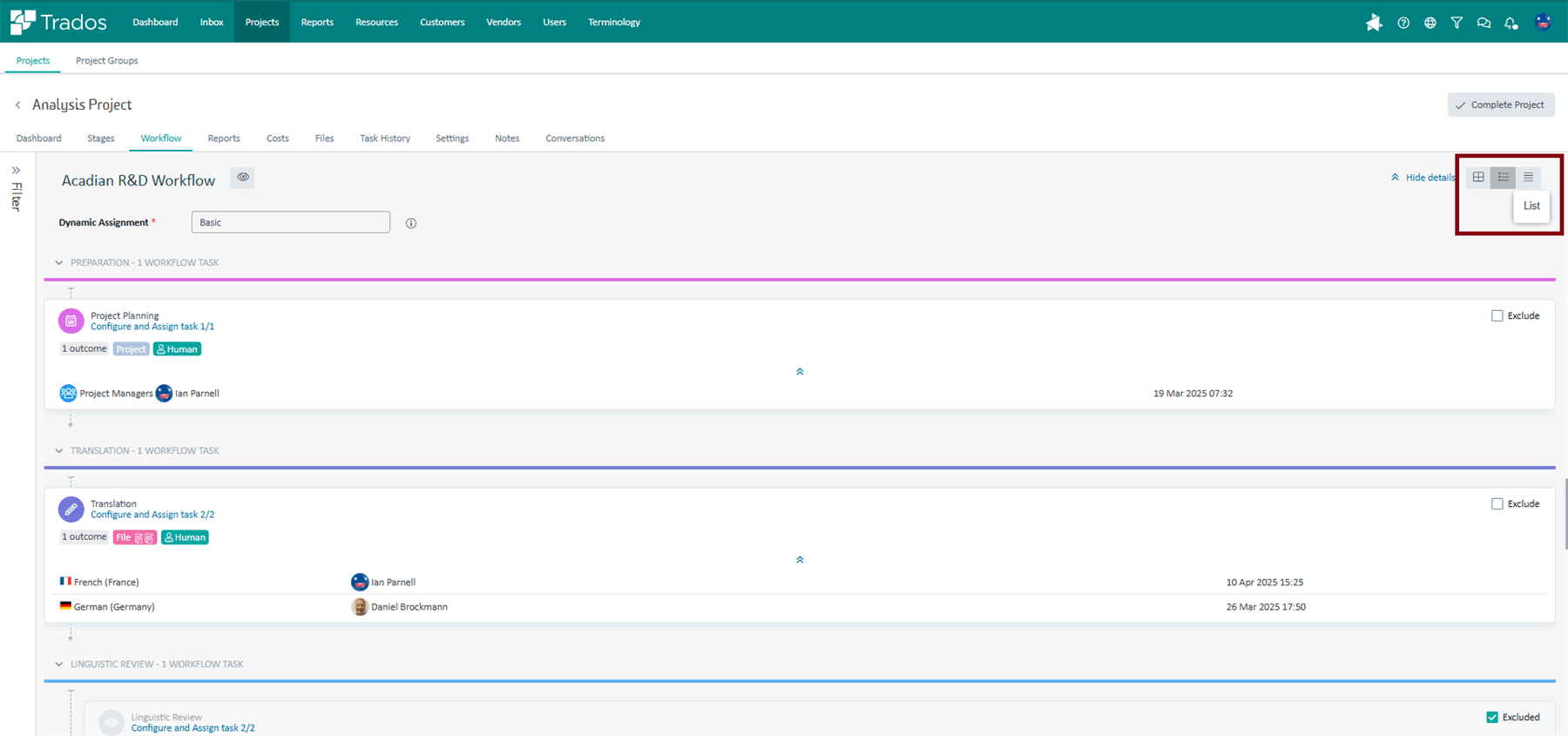 - Which active projects have Translation tasks assigned to [Linguist]?
