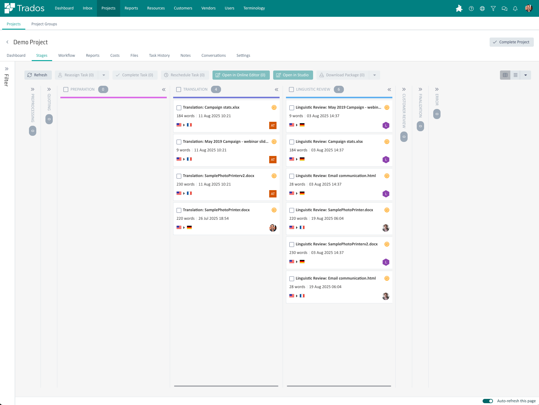 Trados Ignite中的Stages (阶段)视图为您提供清晰可视的快照,显示每个文件在翻译项目中的位置。