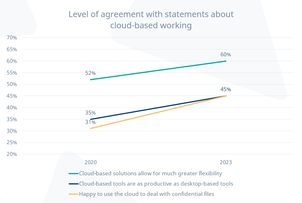 - 45 % meinen, dass cloudbasierte Tools ebenso produktiv sind wie desktopbasierte Tools (Anstieg um 10 %).