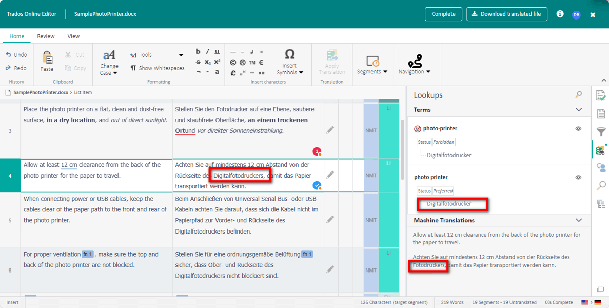 Screenshot der generativen Übersetzung mit terminologiesensitiven Ergebnissen