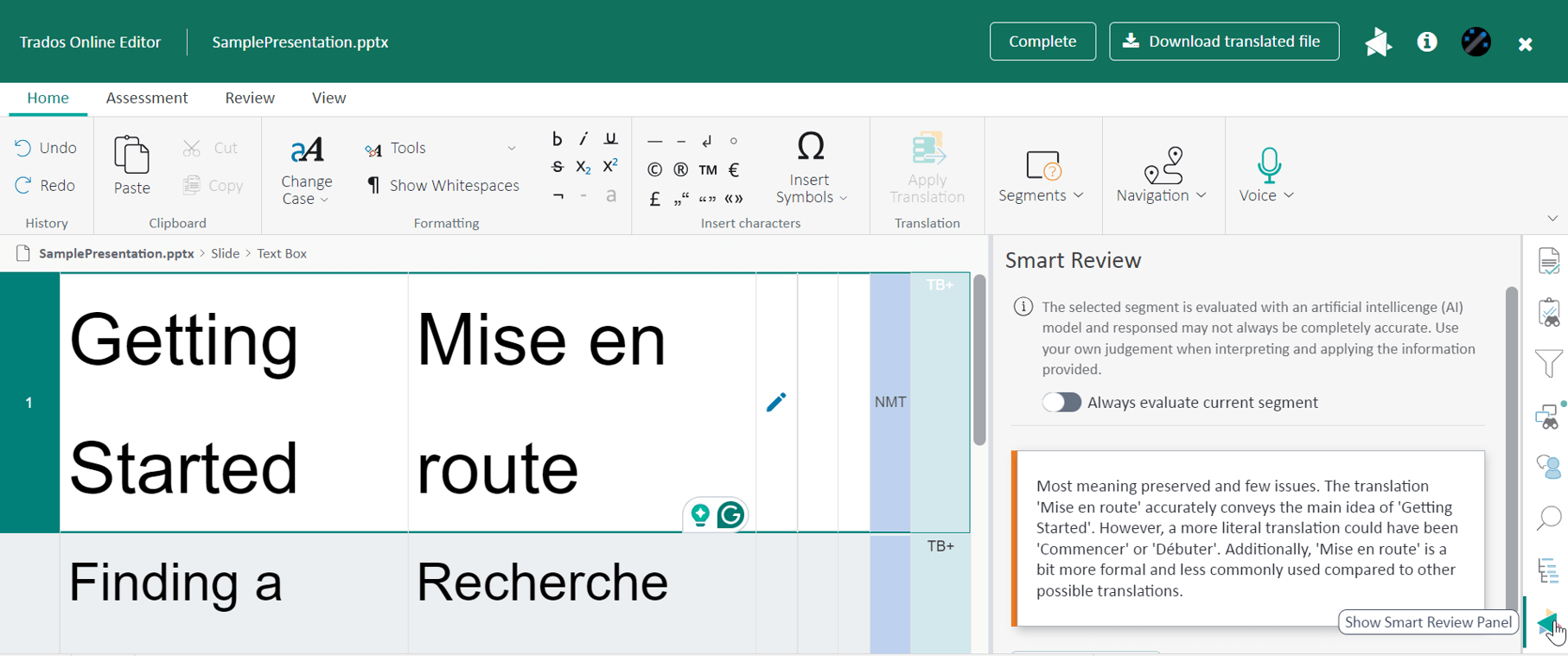 Der Review-Prozess kann oft zeitaufwendig sein und zu kostenintensiven Verzögerungen führen. Mit Smart Review können Sie diesen Arbeitsschritt jedoch erheblich beschleunigen. Mit Hilfe von KI bewertet Smart Review sofort die Übersetzungsqualität, unabhängig von der Quelle der Übersetzung, sowohl im Desktop- als auch im Online Editor. Es liefert hilfreiche Hinweise für die Beurteilung und hilft dem bzw. der Reviewer:in, genau zu erkennen, in welche Segmente er bzw. sie weiter einsteigen muss, was wertvolle Zeit und Mühe erspart. Dies beschleunigt nicht nur die Projektdurchlaufzeit insgesamt, sondern trägt auch zu einer höheren Übersetzungsqualität und -konsistenz bei.
