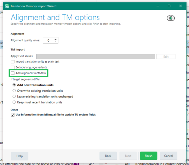 Hay una nueva opción para omitir los campos de metadatos de alineación durante la importación avanzada de segmentos alineados a una memoria de traducción.
