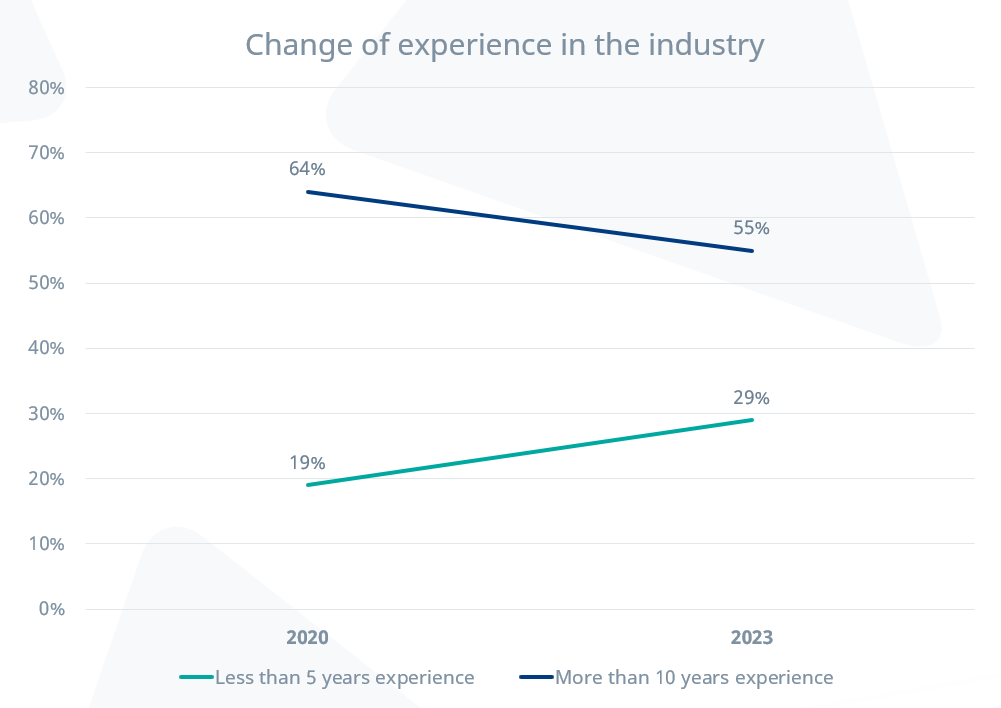 En 2023, el 55 % tiene más de 10 años de experiencia; el 29 % menos de 5 años.