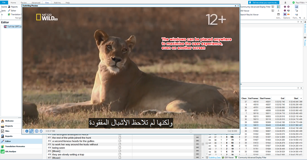 Nuestra aplicación de subtitulado ofrece la combinación ideal de herramienta TAO y herramienta de subtitulado para los traductores audiovisuales, ya que brinda a los usuarios la posibilidad de realizar todas las tareas desde dentro de Trados Studio. A continuación enumeramos algunas de sus características principales, que transformarán completamente tu experiencia en la traducción audiovisual.