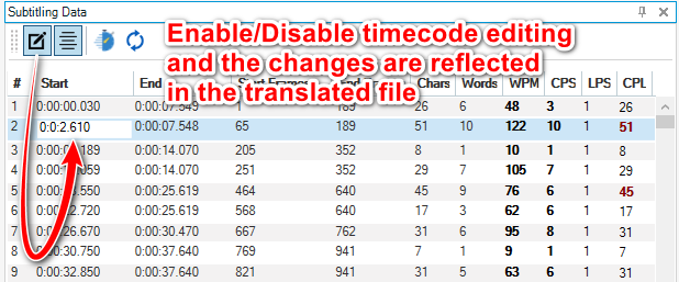 Dentro de la compatibilidad con tipos de archivos, es posible identificar y corregir errores gracias a la posibilidad de visualizar y editar los códigos de tiempo que aparecen junto a la traducción.