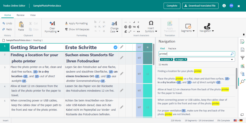 Il potente editor online di Trados Go, con visualizzazione affiancata delle traduzioni e strumenti di produttività integrati.