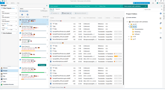 - Un nuovo riquadro della struttura delle cartelle che visualizza la lingua e la struttura delle cartelle del progetto, nonché tutte le attività assegnate al singolo utente nei pacchetti di progetto.