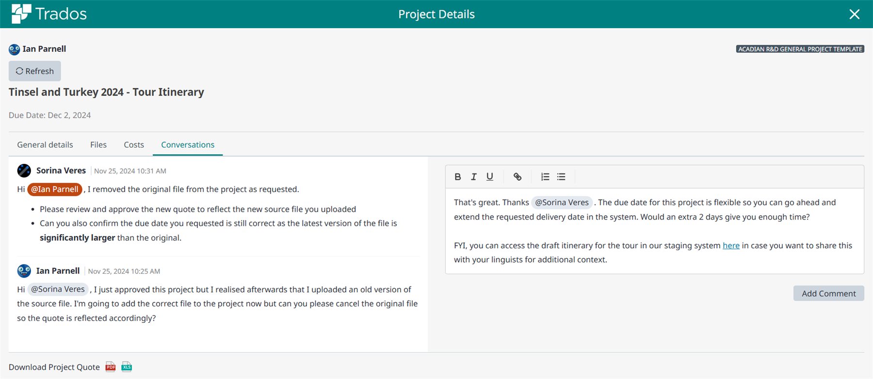 プロジェクト会話や用語集のコメントにリッチテキストのサポートを追加し、この機能をより強化します。この機能強化により、ユーザーはより明確、正確、柔軟にコミュニケーションをとることができ、よりスムーズなワークフローとより生産的なディスカッションが可能になる。