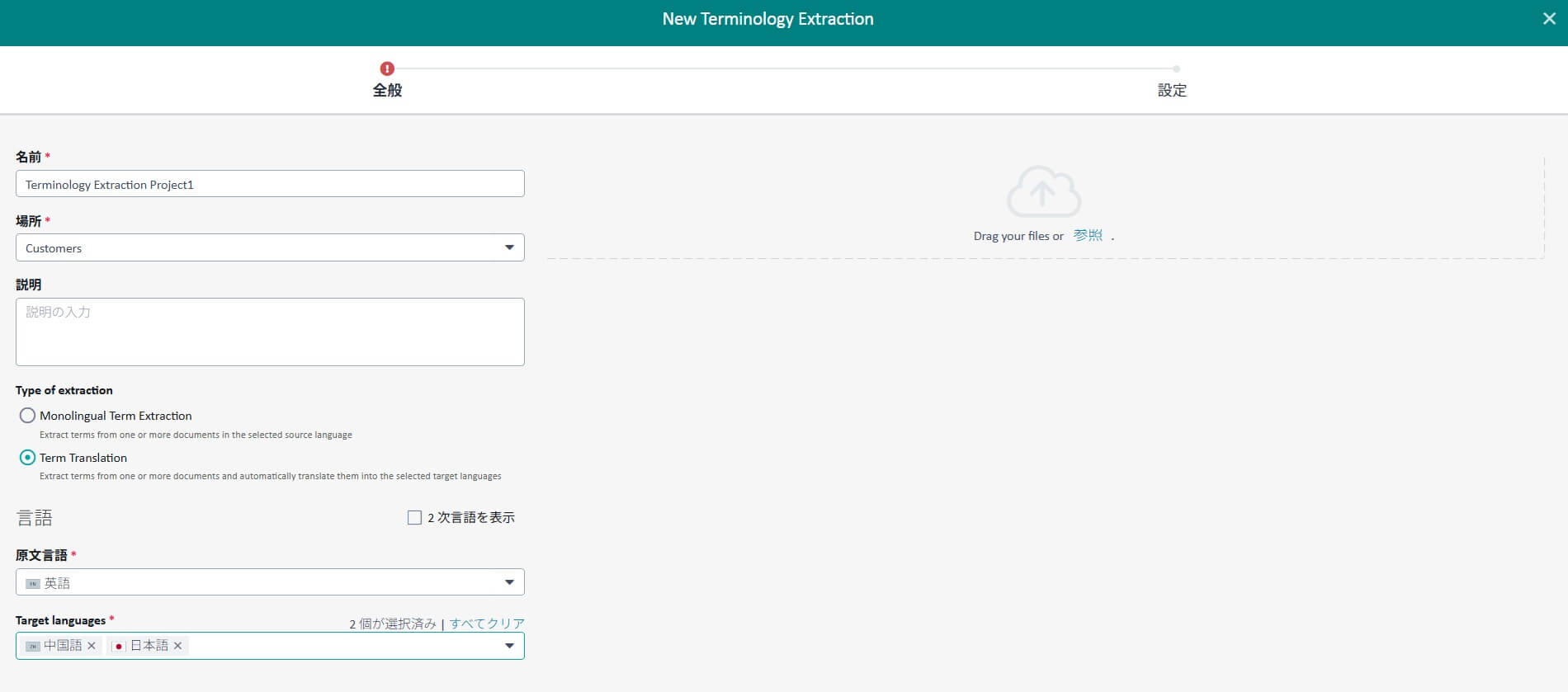 ・[Drag your files or 参照]: 用語の抽出元とする文書をドラッグするか、参照します(複数指定可能)。