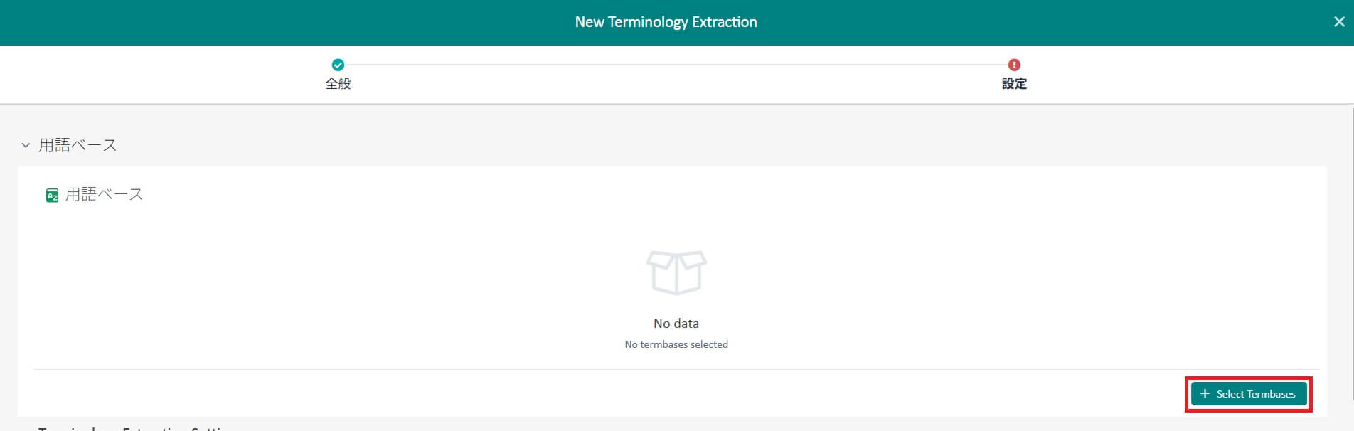 3. [設定] 画面の [用語ベース] セクションで [Select Termbases] をクリックし、抽出した用語の追加先とする用語ベースを選択します。