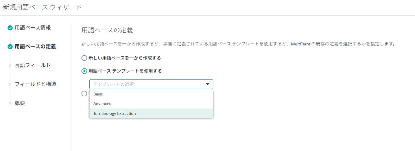 4. ここで既存の用語ベースを選択することもできますが、[Terminology Extraction] テンプレートを使用して作成された用語ベース以外のものを選択すると、Terminology Extractionの実行中にエラーが発生します。