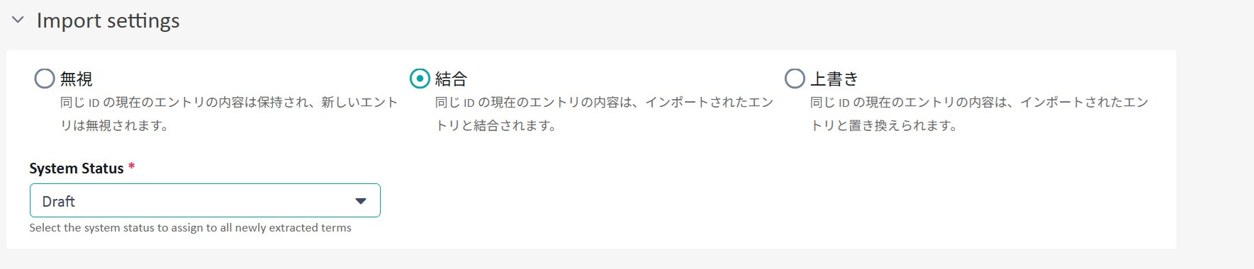 その下の [System Status] では、抽出されたすべての用語に割り当てるステータス(Draft、Preferred、In Review、Recommendedなど)を選択します(デフォルトは [Draft])。