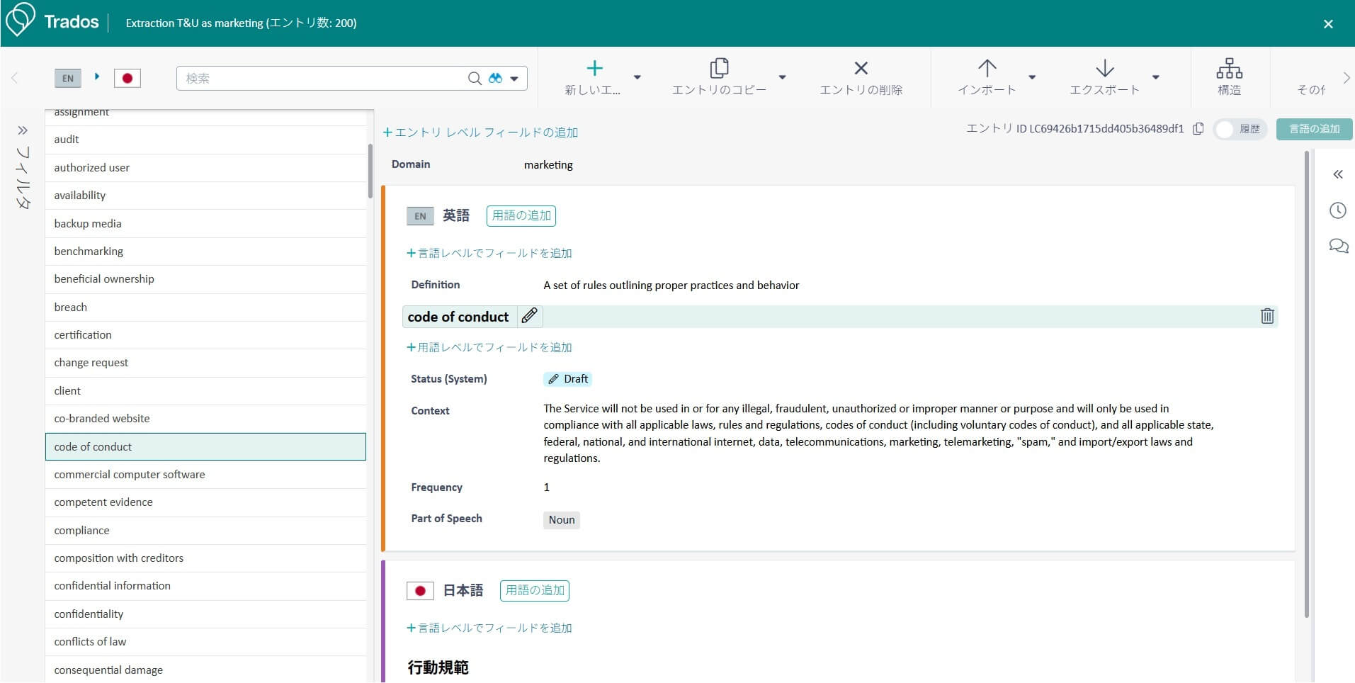 Terminology Extractionによって抽出された用語や訳語は後から編集したり、新しい用語追加したりすることもできますので、少なくとも、今後時間をかけて構築していく用語集のベースラインをすばやく手に入れることができます。