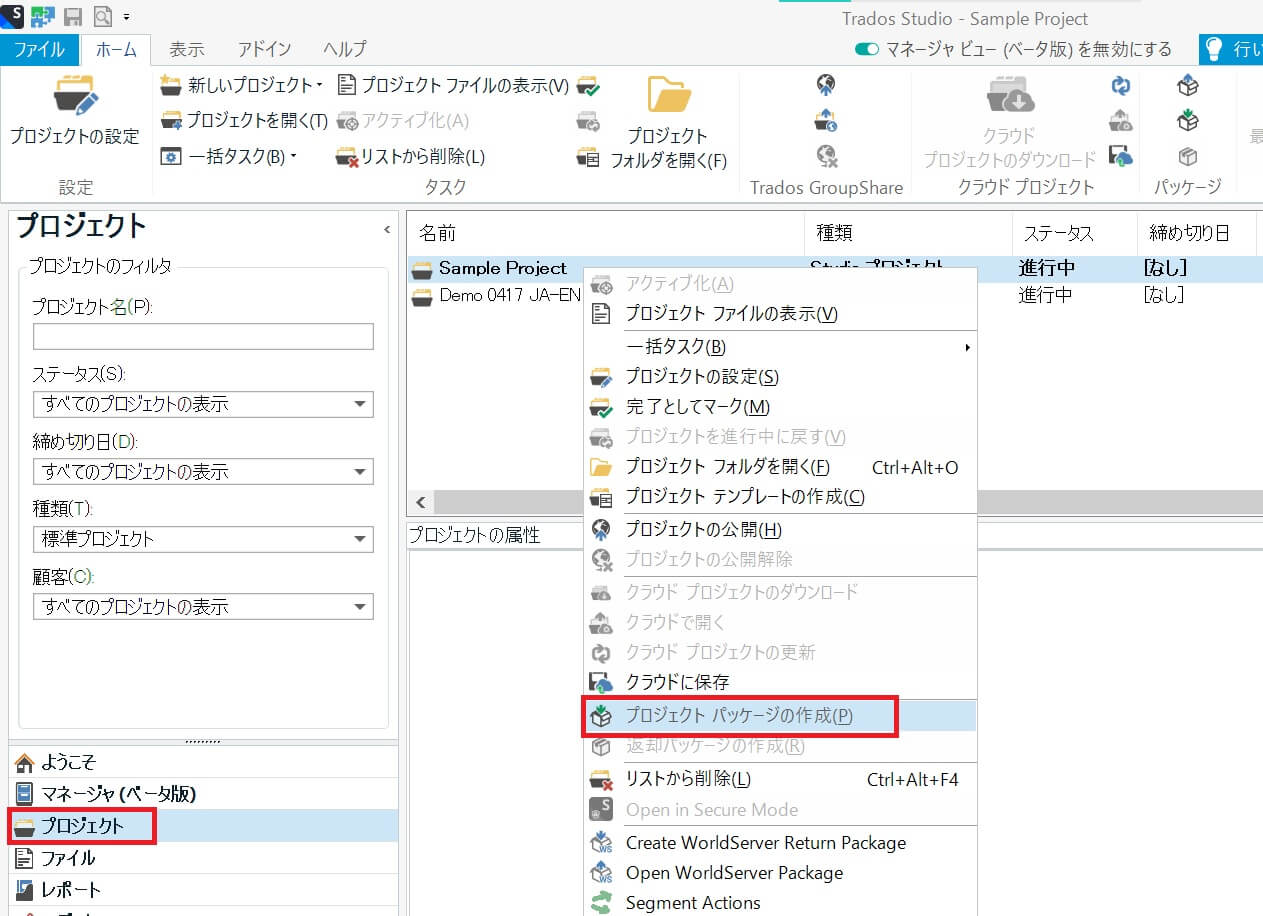 注: プロジェクトパッケージを作成する機能はTrados Studio Professionalエディションのみでご利用いただけます。