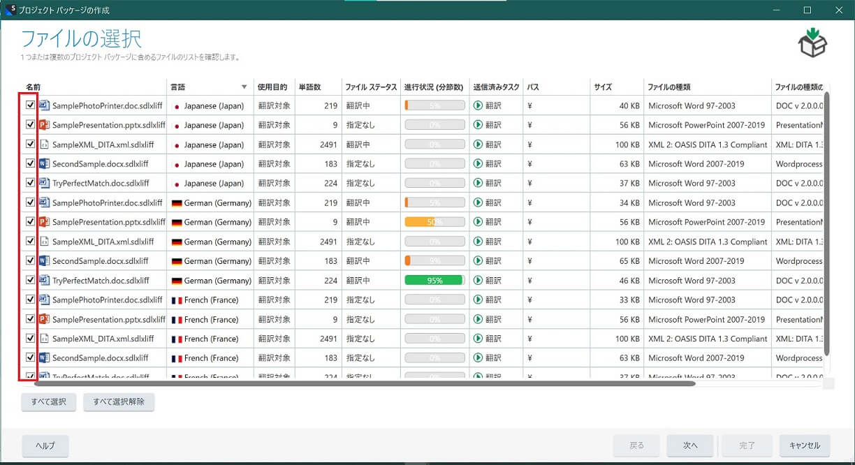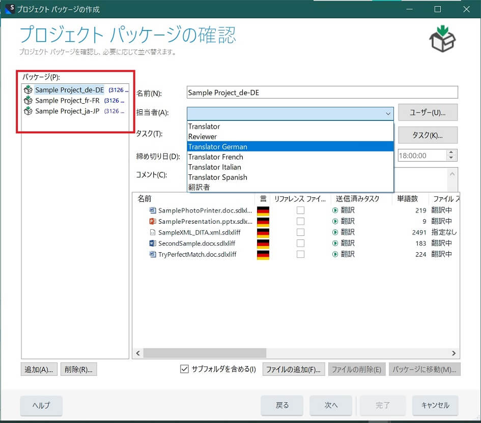 上記のオプションを設定して画面下部の [完了] をクリックすると、選択したバイリンガルファイル、翻訳メモリ、用語ベース、およびプロジェクト設定を含むプロジェクトパッケージ(.sdlppx)が作成されます。