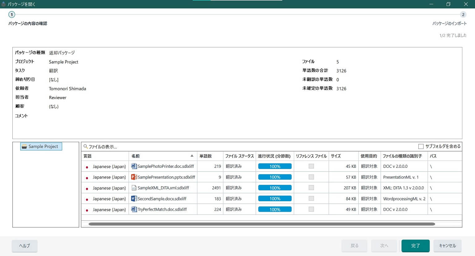 - [パッケージを開く] ダイアログでパッケージに含まれる翻訳対象ファイルやリファレンスファイルを確認し、プロジェクトパッケージを展開してプロジェクトを作成する場所を [プロジェクト フォルダ] フィールドで指定して [完了] をクリックします。