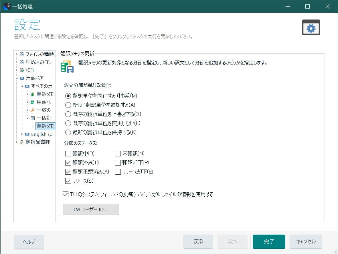 - 下図のページで原文分節が同じで訳文分節が異なる場合にどう処理するかや、翻訳メモリに取り込む分節のステータスを選択し、[完了] をクリックします(このページのオプションについては詳しくは、「バイリンガルファイルからの翻訳メモリ更新」をご覧ください)。